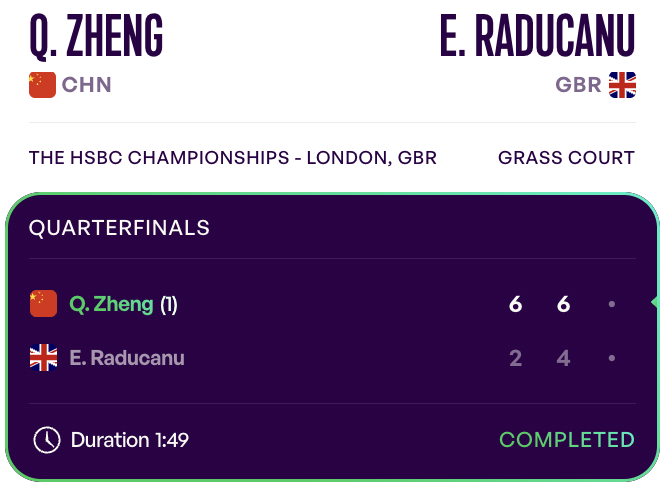 北京时间6月14日凌晨,WTA500伦敦站展开女单1/4决赛角逐,头号种子、中国球员郑钦文直落两盘击败前美网冠军拉杜卡努,今年第二次闯入巡回赛半决赛。
